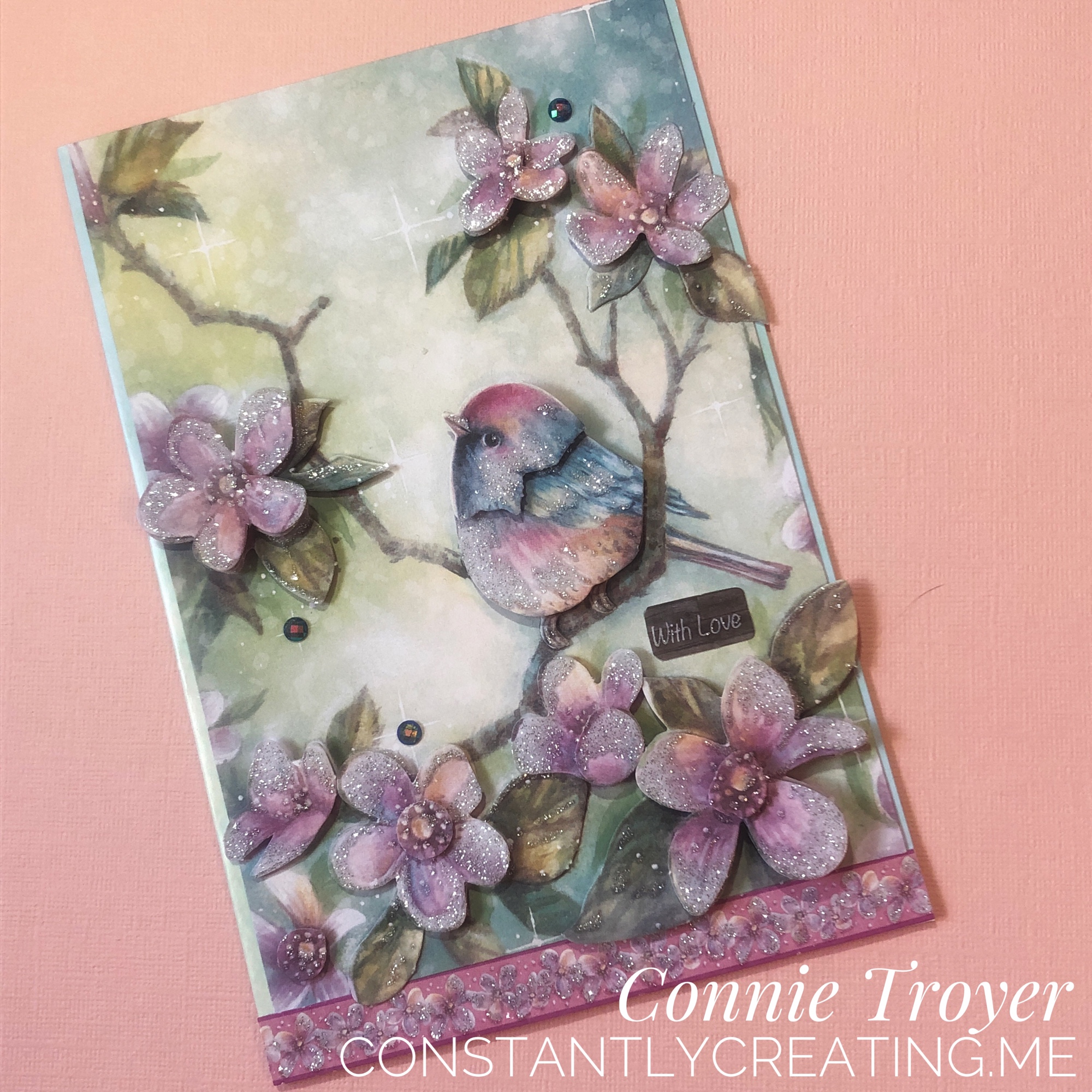 I made a sweet little 3D dry decoupage card from a UK magazine kit last week when I was supposed to be cleaning off my desk. It was just too irresistible not to make! Silver glitter accents the bird, flowers, and bottom border. Foam pads pop up various levels of flowers and the bird for definition. I modified the “Made with Love” label they gave me so it could be used with several kinds of cards. I think I will add matching paper and a butterfly to the inside. It’s the perfect little springtime card.