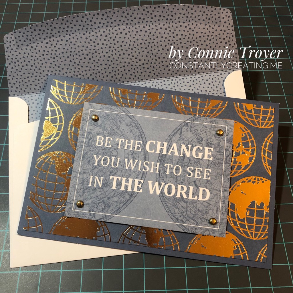 I used a piece of Misty Moonlight cardstock for my A6-sized base first and then picked the large foiled globe card and the smaller 3×4 “Be the Change” card out of the card pack. I adhered the largest card with my preferred glue, and then I measured (yes, I actually measured!) and punched 3/16” holes in the corners for some 3/16” gold brads. Once I had the brads fastened, I popped up the card on foam dimensionals. And that was it! I used a Misty-Moonlight-lined envelope from the Flowers for Every Season Cards and Envelopes and called it done. 😂 I guess simple and easy really is the best. (The next post about a fancy grad card I did this week will be the opposite!) Most of all, I liked the sentiment on this card. I think it could even be used as a grad card, a masculine card, or one of encouragement. Thanks again for visiting, and stay tuned for more when I get time!