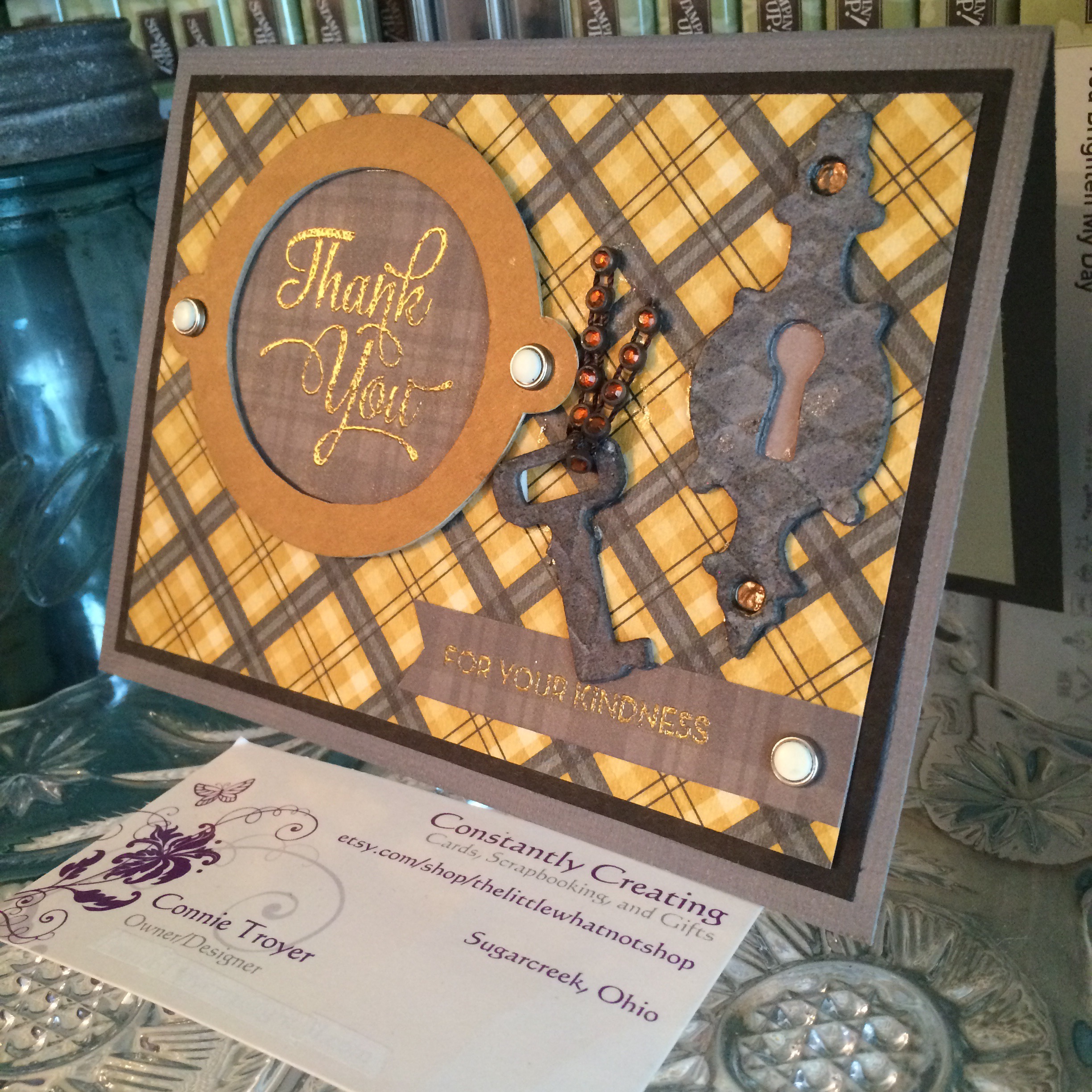 I’d found a miscellaneous round raw chipboard frame (possibly Colorbok?) while I was digging in my embellishments that fit the smaller sentiment perfectly. I covered it with gold metallic paper from DCWV…and I used the flip side of the keyhole paper from K and Company behind the frame and for the small banner that held the second part of the sentiment, “for your kindness” (also previously approved). Plaid again, of course – it matched.