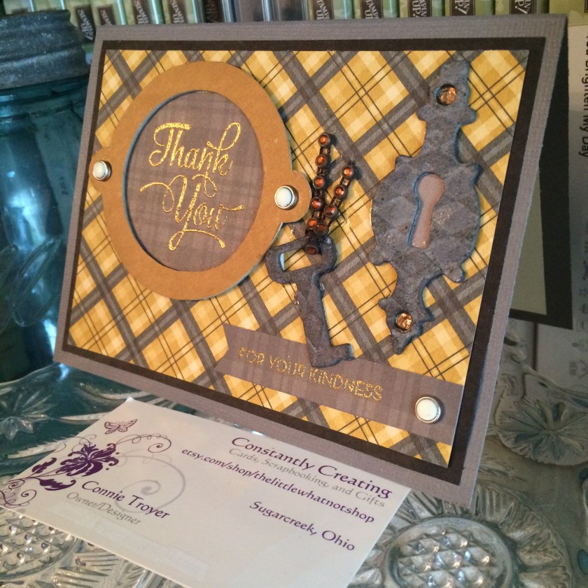 After the key/plate set was done, the rest was easy. Candy brad bases, pushed through the paper to hold the sentiments (Stampin’ Up, retired), Dark Chocolate Liquid Pearls (Ranger), double-sided matching paper behind the keyhole (K and Company), and gold embossing powder (Hampton Arts) for the sentiments. I thought about running a ribbon behind everything to tie it together but didn’t like the placement of the key with it, and I worried that it would make things look too congested.