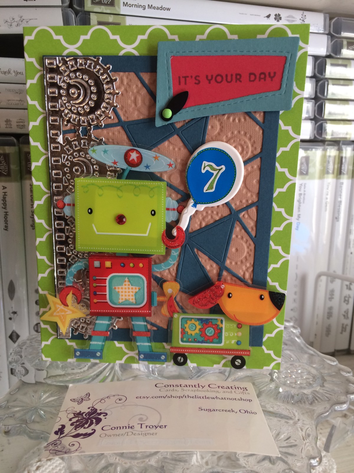 So there I was with my SU Not Quite Navy cardstock mosaic die-cut piece on top of the embossed tan gears, both hovering above the 5×7 green Moroccan-patterned card base. NOT what I had imagined for this card. (I only have ten types of premade card bases. I often make my own, but whatever was the shorter route to finishing the card had my vote today.) I decided to fill in some of the mosaic holes I’d already taken out, thinking it would look better. I really wanted to add in a red color to the mosaic but didn’t want to fight that die again, so I went on. Looking at the combination of those four elements almost made me nauseated, but I’d taken too long at that point to reverse direction. It was time for robot stickers. And then to look for a balloon so the robot didn’t appear empty-handed – plus I wanted to fill in some of the space below the sentiment but above the dog. The brand-new sticker pack that held my balloon then stuck to the inside of its plastic, so I’m not sure how many of those are even useable any longer. But at least the balloon didn’t suffer.