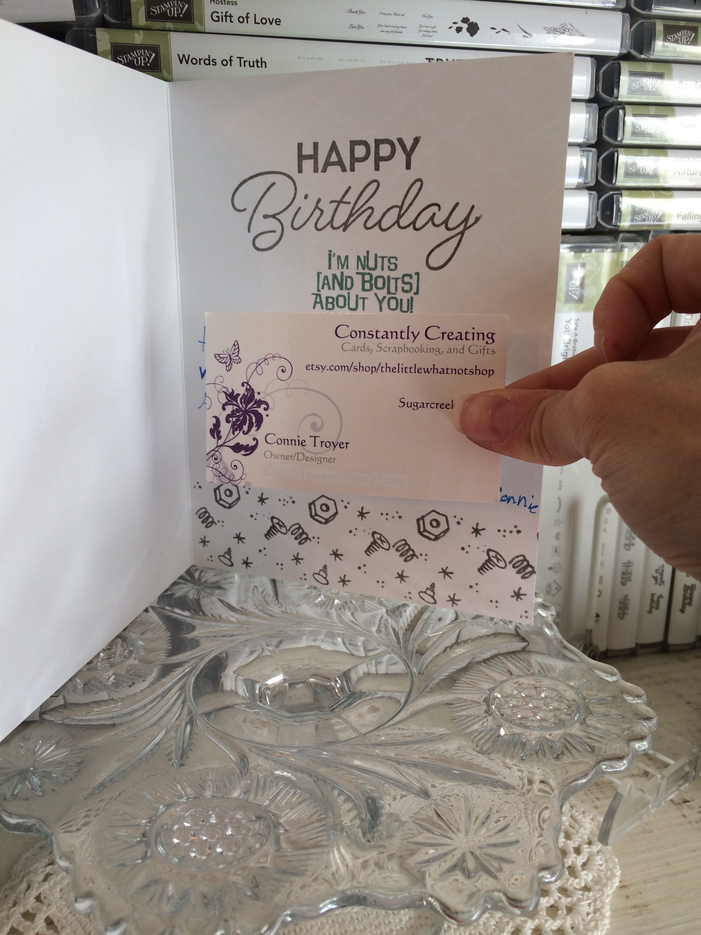 I moved on quickly to the inside, since I was supposed to be leaving my house for the party right about then. Stamped all three correctly in Basic Gray Archival ink and SU Lost Lagoon ink (hooray! No wasted time or covering up mistakes!). The “Happy Birthday” stamp is from Stampin’ Up’s “Birthday Blast.” “I’m Nuts and Bolts about You!” and the random nuts and bolts pattern I used as a border are from Stampendous/Fran’s (SSC1033). This is the second time I’ve used the Fran’s set and I like it very much.