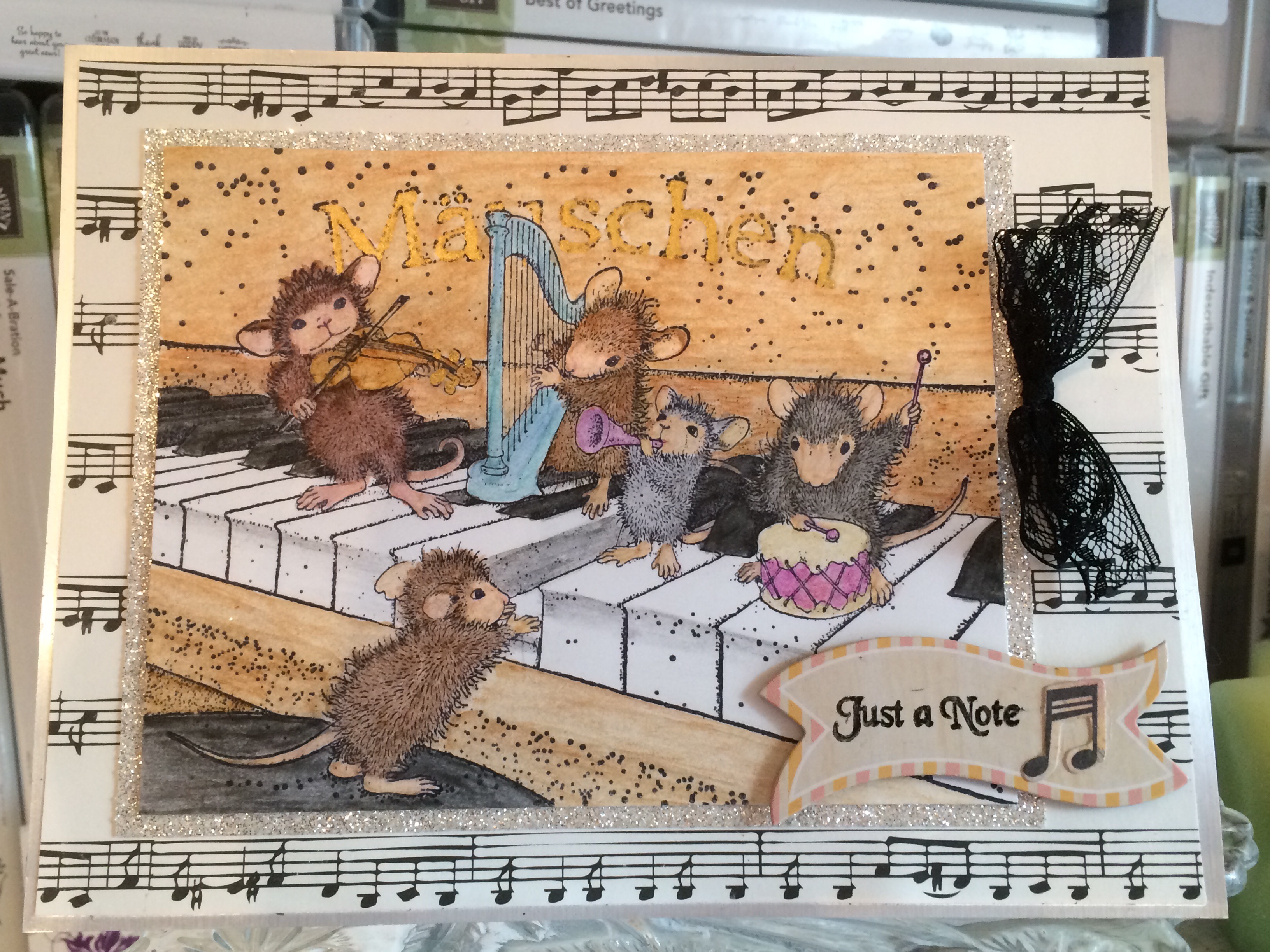 I took a break from Christmas cards to do up a few birthday cards that I needed to deliver or mail. One of them went to my aunt, who is a supremely talented pianist. I had thought of using this focal image for her ever since I first got my hands on this cute House Mouse stamp.