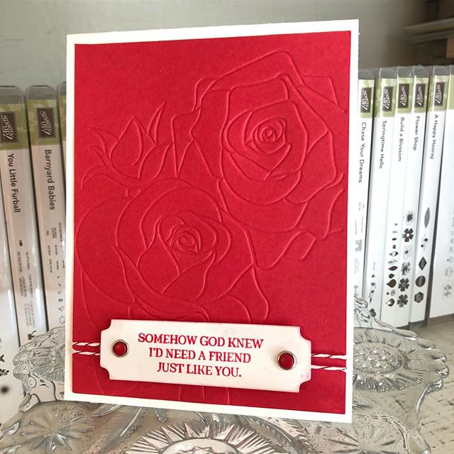 I have a lady who periodically orders cards from me and enjoys seeing whatever creativity comes through, rather than give me specifics on how she wants the cards done. Her style–clean and simple–is sometimes a challenge for me, as I naturally tend to complicate life, but sometimes it’s also really refreshing to not have to overthink every little thing. Sometimes it’s just so nice to find a few simple bits and put them together quickly in a pleasing arrangement–leading me to wonder why I don’t do that kind more often. 🙂 This “embossed red roses” card was one of those for her.
