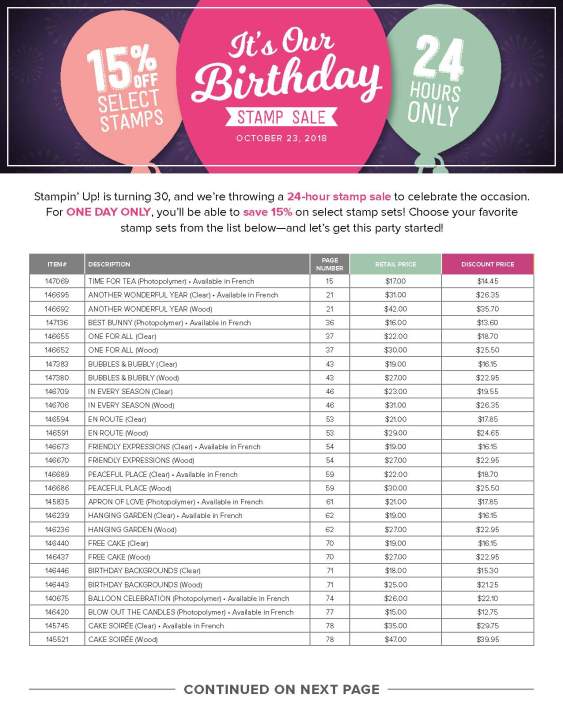 Everybody loves birthdays, right? Well, maybe that depends on how old one is turning. 😉 But there’s no reason not to love the fact that Stampin’ Up turns thirty on Tuesday, October 23! Join in the celebration by shopping their one-day sale; they’ve reduced thirty stamp sets by 15%! (Plus, there are still good items on the clearance rack, and bundles are 10% off!) You’ll find seasonal sets, ones that coordinate with dies and punches, sentiments, colorable images, flowers, birthday sets (of course!), and more!