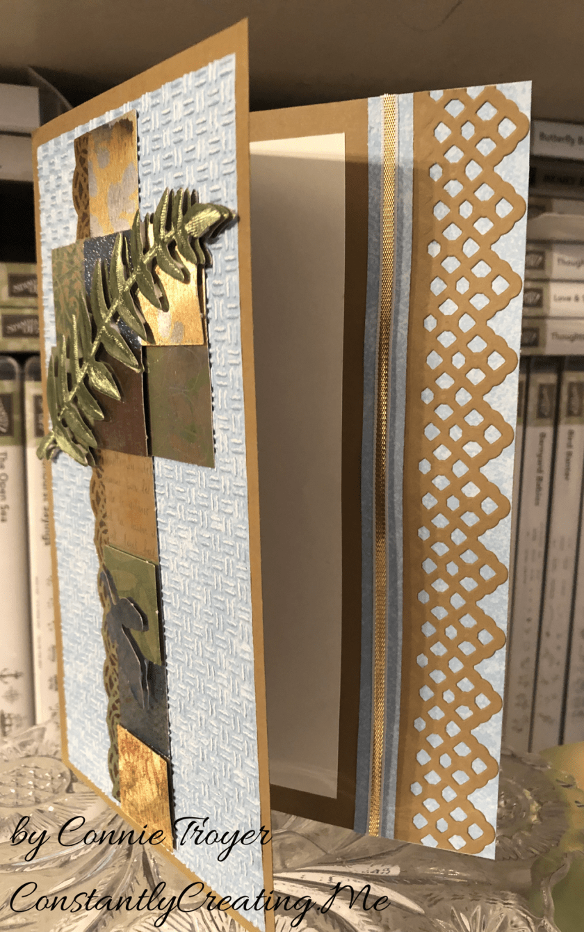 The trouble was that when I left that breathing room space between the die cut and the base, it was not centered once the card was opened. I didn’t like that. But it looked like I had enough room to add 1/8″ of ribbon or something else. I chose SU’s gold and white ribbon to match the cross and the browns and loved how it looked.