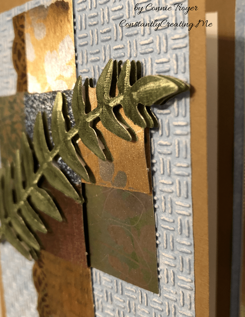 Here’s where things got tricky. The card is a 5×7 because the cross is so tall. But because it’s narrow, there was a lot of “white space” around it. I don’t like white space (even if it’s blue). So I started to wonder what I could do or put next to the cross to take up the width. A sentiment would only be so big, as well as being awkward to work with around the 3D leaf layers toward the bottom, so I wasn’t sure that was the answer. I thought maybe I could make a decorative edge to the card front at the right instead. I could see it in my mind but wasn’t sure how to achieve it (story of my crafting life, btw). That seemed to be the best thing to try…but all my dies were too small to stretch across 7 inches. Nothing felt right. So that night I went to bed frustrated, having made only the card base and embossing the paper.