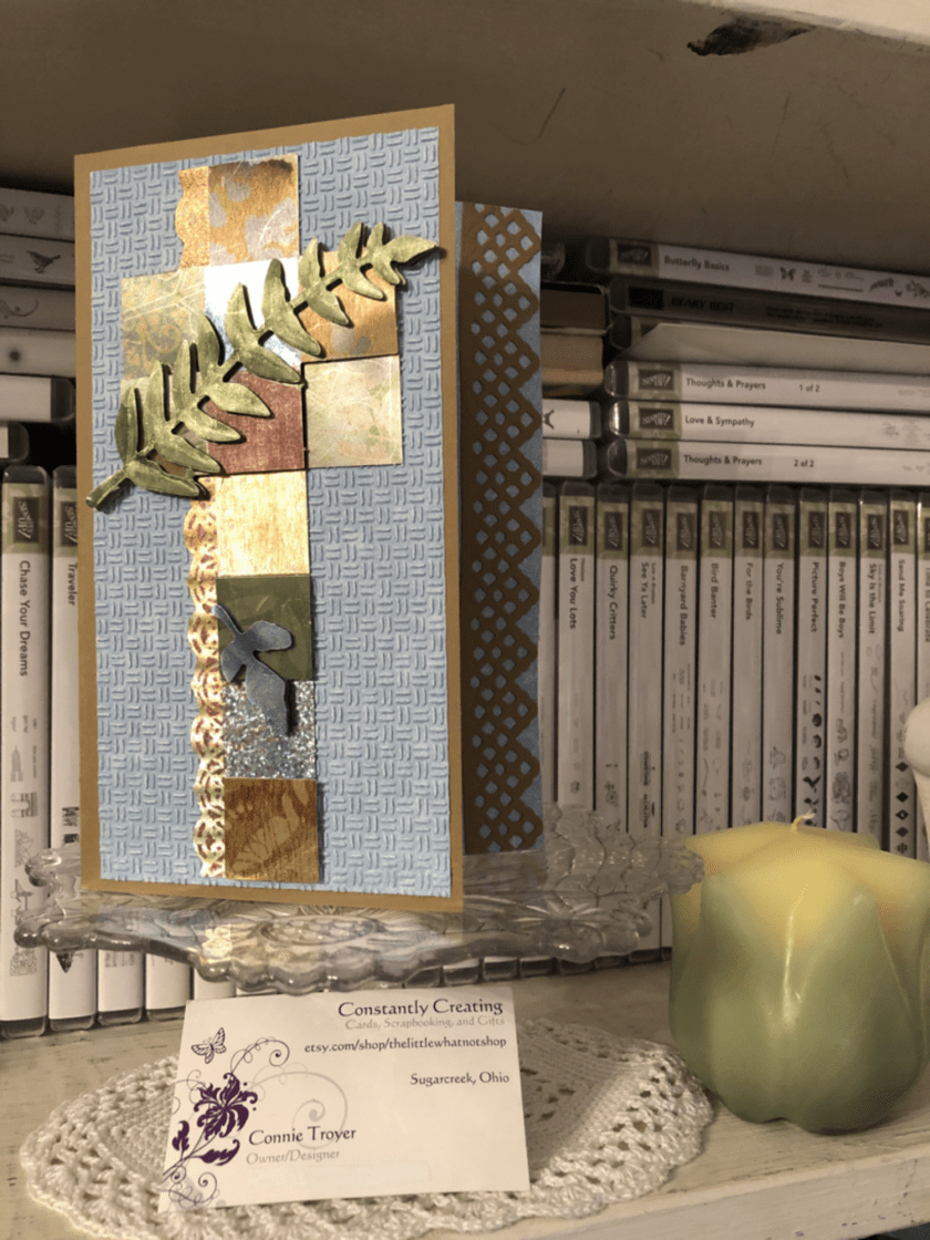 One of my husband’s coworkers lost her dear husband last week, and it’s been such a sad thing. I wanted to make a beautiful card – part masculine in remembrance and part feminine for her – but had no idea where to start. Since I often clean or organize when I have a problem to mull over, that’s what I ended up doing, which led me to the main cross piece seen on the front of the card today.