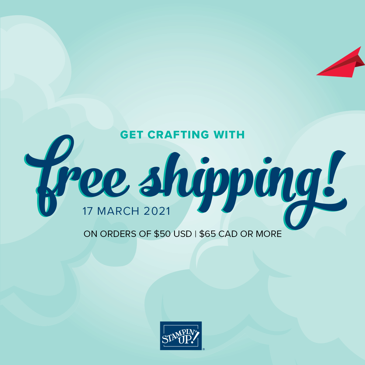 Heads up, crafters! Stampin’ Up is offering FREE SHIPPING for one day only—March 17—till midnight, on orders of $50 before tax/shipping are figured out! (If you have coupons to add to your order to lower the price, the total you will actually pay still needs to be $50 or above before tax.