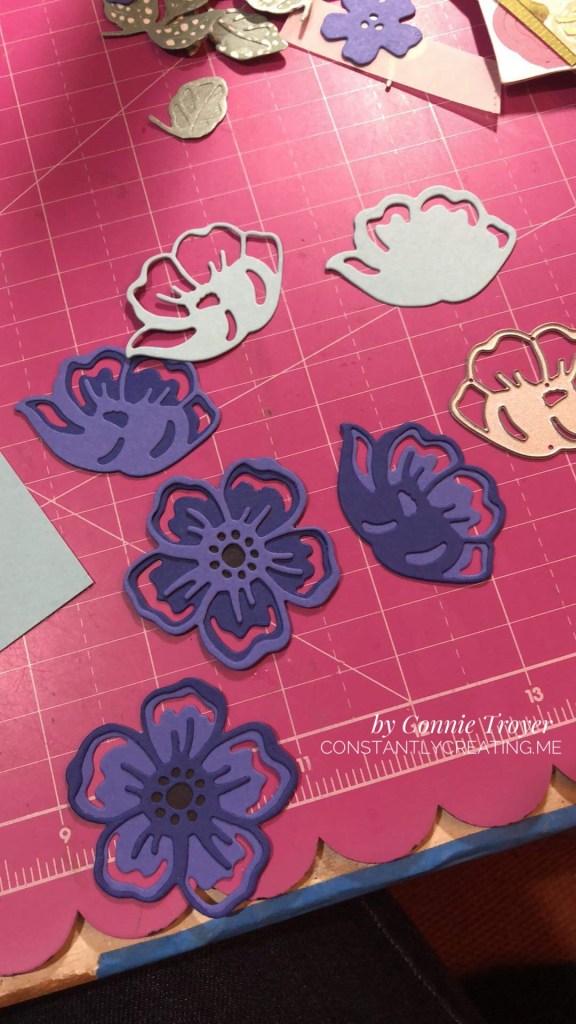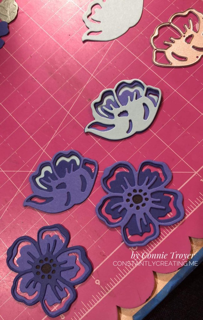 I was initially going to place some vellum atop the Fancy Flora DSP, because the more I looked at that piece of paper, the less I liked it (sorry, honesty warning). I was afraid it would be too bold or contemporary against the beautiful flowers I was planning from the Summer Shadows Dies. But once I had more of the final pieces together and ready to glue, I thought the vellum muted the pattern too much—almost like a white-out, with a sheet of blue on the bottom. Off it went, as I played with which colors to put where on those die-cut flowers and how exactly to arrange them.