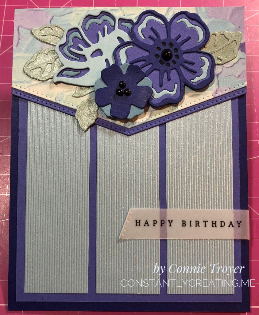 This card had a lot of decisions with it, some of which I’ve already mentioned. I also had to decide whether to use the same amount of layers as Merritt’s, whether to add a solid border underneath the patterned paper (where the black edge is on Jennifer’s), the size of the three sections, which colors of flowers would look best against the Fancy Flora DSP, and more. Finally, things looked “right,” but it took time and video calls with two crafty buddies to get me there. (Aren’t crafty friends the absolute best for brainstorming? I’m thankful for T & E with this round.) Sometimes it just helps to take pictures and talk things through. I ended up with one less layer than Merritt’s; flowers using Balmy Blue, retired Marina Mist, and In-Colors Starry Sky and Orchid Oasis with leaves of IC Soft Succulent from the Brushstroke Specialty Paper; a solid border under the banner, and striped sections that are 1-1/8″ across. And no vellum after all.