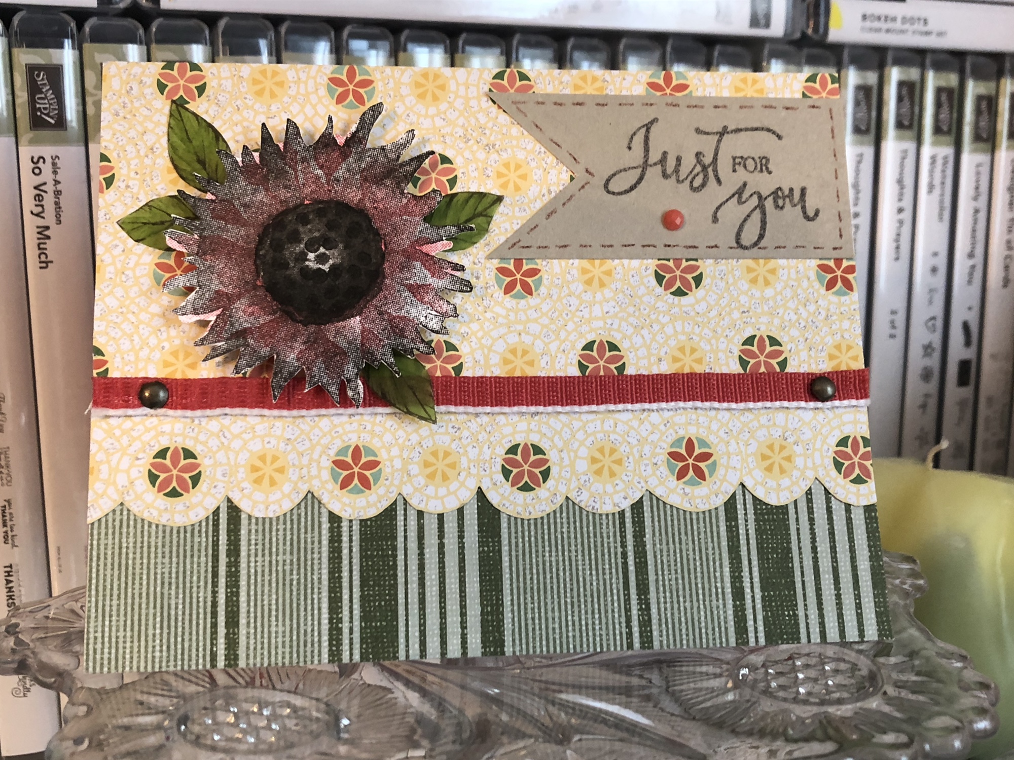 This card had a lot of decisions with it, some of which I’ve already mentioned. I also had to decide whether to use the same amount of layers as Merritt’s, whether to add a solid border underneath the patterned paper (where the black edge is on Jennifer’s), the size of the three sections, which colors of flowers would look best against the Fancy Flora DSP, and more. Finally, things looked “right,” but it took time and video calls with two crafty buddies to get me there. (Aren’t crafty friends the absolute best for brainstorming? I’m thankful for T & E with this round.) Sometimes it just helps to take pictures and talk things through. I ended up with one less layer than Merritt’s; flowers using Balmy Blue, retired Marina Mist, and In-Colors Starry Sky and Orchid Oasis with leaves of IC Soft Succulent from the Brushstroke Specialty Paper; a solid border under the banner, and striped sections that are 1-1/8″ across. And no vellum after all.
