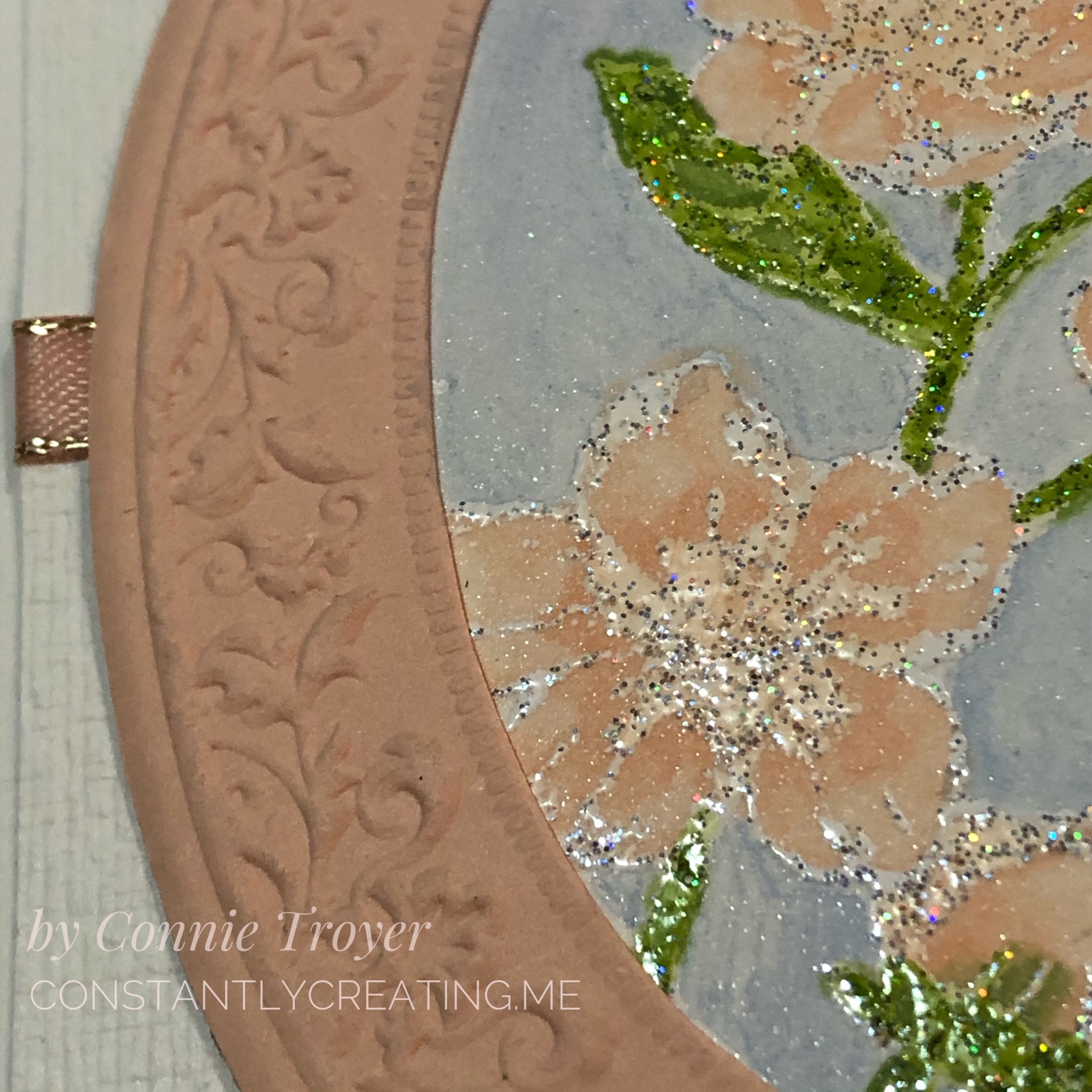 When I was working on the oval, I had trouble getting the embossing perfectly centered in the die-cut, and that bothered me—and it also took up more of the card front that way, room I needed—so I trimmed off the excess around the crimped part. It lays flatter now anyway without the extra border edge. Once I had that done, I used it to figure out how I wanted to show my flowers inside it. They are stamped at an angle. I actually had a different angle chosen, but I didn’t glue it in the same way I had set it, so watch that if you do it. Mark a place at the top so you don’t twist it too far to the side. I cut a small section of Shimmery White Cardstock for the flowered piece, which you can see some of in the blue background in closeups. This card is quite shimmery everywhere you look!