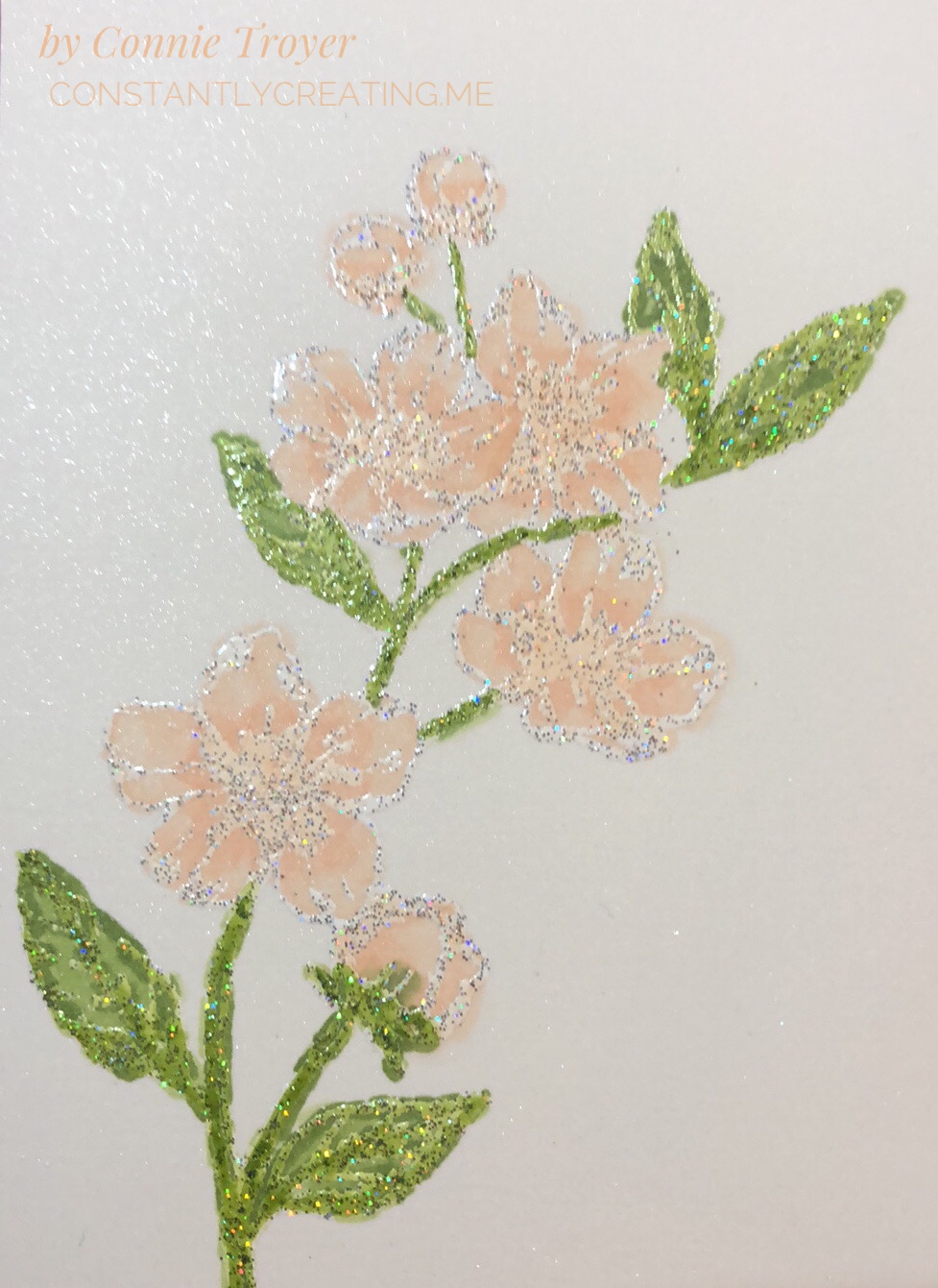 To color the flowers, I used my Dark Petal Pink, Light Granny Apple Green, and Dark Granny Apple Green Alcohol Blends, as well as the Color Lifter. I tried to work with the Ivory too, but I had to lift the color right out of it because it felt too dark on the buds I colored. (I used to have a Light Petal Pink Blend and wanted to use it, but at the last show where I was a vendor, the cap didn’t get put back on correctly and I didn’t catch it until it had already dried out. So I have to order a new one.) When I colored the flowers, I went over the centers and extended the color some with the Dark Petal Pink first, then lightly went over everything with the same marker, and then took the Color Lifter to the outside edges of the flowers or buds. I would have also liked to have left some white on the flowers to look more like the DSP in the Parisian Blossoms Specialty Designer Series Paper, but it just didn’t work out that way. The embossing on the flowers and leaves is really where all the shading and shadowing is, so it felt more like reverse coloring as I worked with it. There’s not a lot of space in the flowers that isn’t embossed. I did color right over the embossing, and it does not rub off (though I did not intentionally test that when it was wet).