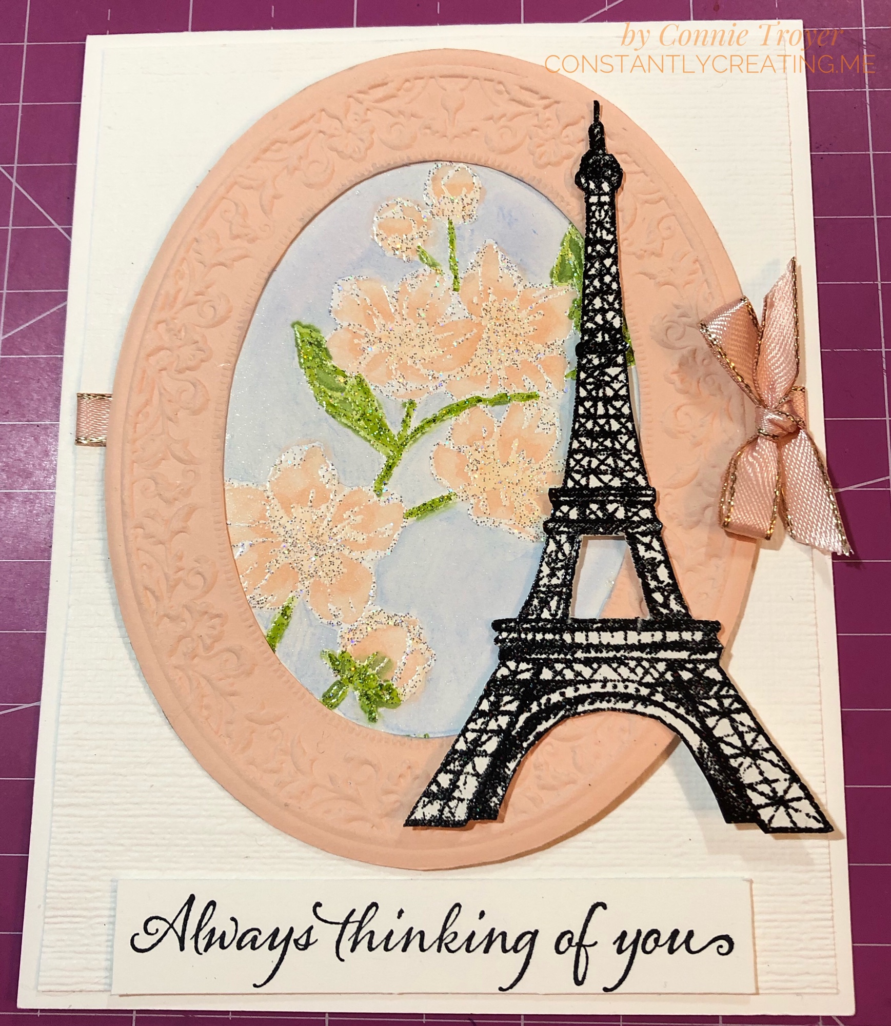I popped up the Eiffel Tower with Mini Dimensionals to help the height of the knot at the edge of the card, so some of the cherry blossoms on top of it are glued flat and some have been half glued flat and half popped up. The littlest blossom actually has two half Mini Dimensionals at the right and is glued on top of the others otherwise. I knotted a small bow with the 1/4″ Petal Pink Metallic-Edge Ribbon (the last of my sample from OnStage!) and used glue dots under it, on top of the ribbon that was wrapped around to the back, to keep it in place.