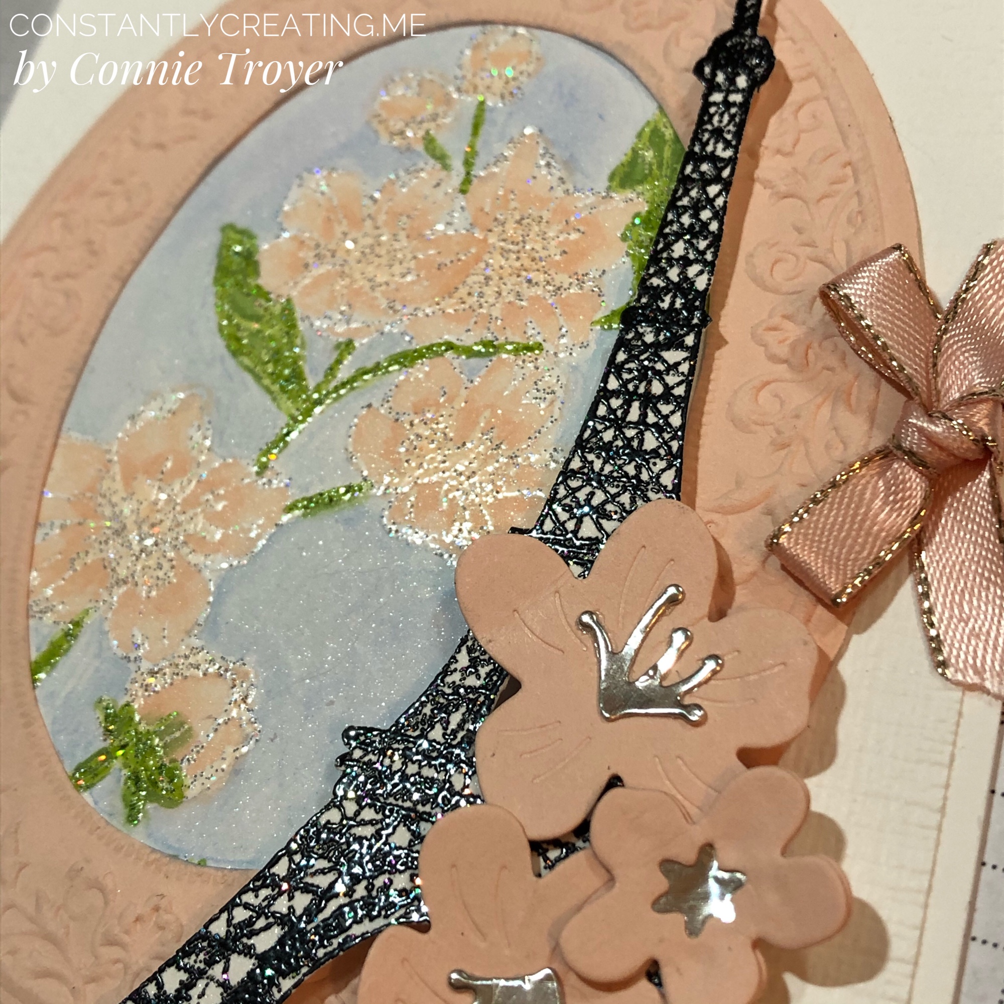 I used the Cherry Blossom dies for the flowers on top of the Eiffel Tower. The stamens and star center were cut out of Champagne Foil and the flowers themselves out of Petal Pink cardstock. I actually doubled the littlest blossom, sandwiching the foil in between to make sure it stayed where it was supposed to. I wanted the blossoms to curl up a bit and had to use the tip of my Tombow Mono Liquid Glue to get the curves I imagined, instead of my large ball tool that was “somewhere.” The dies emboss curving lines in the flowers when cut, as well.