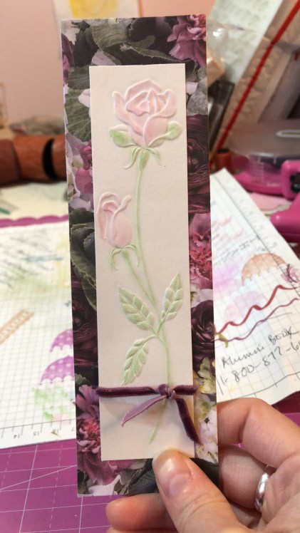 Initially, the rose image was entirely cream-colored, but it just wasn’t showing up well once I backed it with the Petal Promenade Designer Series Paper from Stampin’ Up. It faded away in the background instead, which wasn’t good for a focal piece. So I brought out my retired Stampin’ Up chalks and lightly spread some corresponding chalk colors over the raised areas on the rose (hoping I wouldn’t get too heavy with it, as I only had one of it!). I used a couple of the chalk applicators that comes with the set, but I have also used Q-tips in the past. I think the rose was a scrap from a mass-produced card. I decided to upcycle it. 🙂