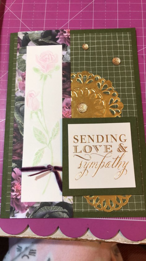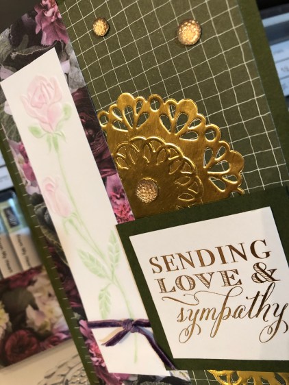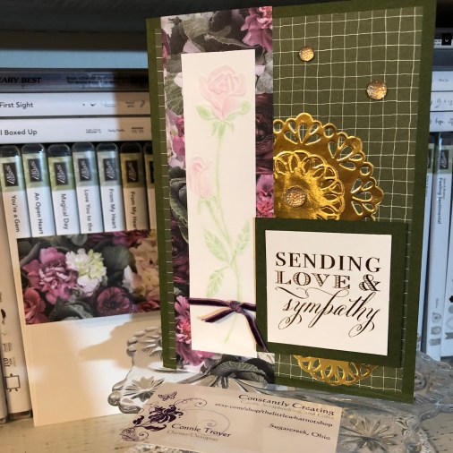 I was recently commissioned to create a custom sympathy card for a woman’s special friend who lost her daughter. My customer and I texted about various options and decided to go with a green theme, the gold-foil “Sending Love & Sympathy” square sentiment by Anna Griffin that you see here, and the cream-backed embossed rose image on the left of the card.