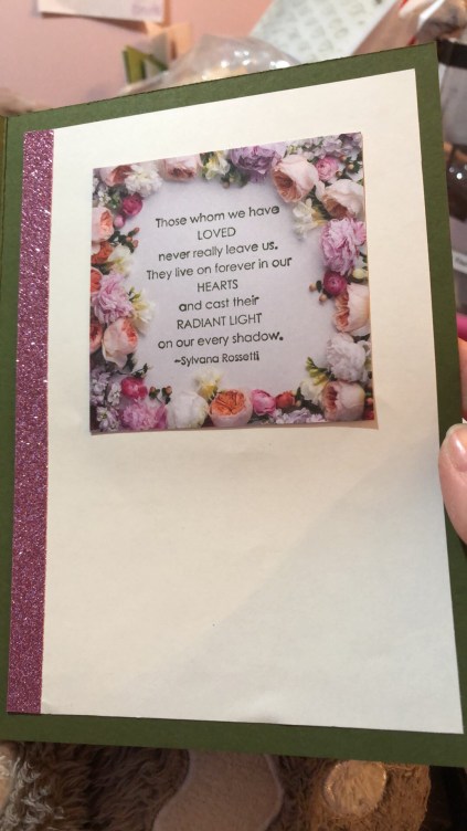 On the inside of the card, I placed a random pink glitter paper strip I had been moving around my desk (it might be from a Martha Stewart 12×12 paper pack), and then, more intentionally, I cut out a blank, flowered sentiment square also from the Petal Promenade DSP pack. My customer and I had decided to use the Sylvana Rossetti quote from the retired SU Love and Sympathy stamp set, and it fit perfectly inside the square. I used Mossy Meadow for the ink color. I was thankful to have used my stamp platform so that I could reink it if I needed to (and I did).