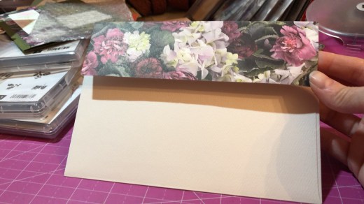 Some of my Stampin’ Up team members like to decorate their envelopes. I do it once in a while, but I generally forget to by the time I create and am ready to photograph and move the card on its way. This time I really wanted to show more of that beautiful Petal Promenade paper and make the card really feel special and coordinating with its envelope, so I took the time to measure and cut a section for the flap. The paper is simply too pretty to hide, and this way it won’t cost extra at the post office, as doodads on the front of the card will (unless they are flat like images stamped onto it).