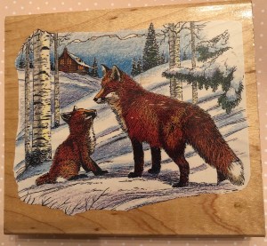 Back in the summer, I was asked to make a special birthday card for a special friend’s son who has a fondness for foxes—all shades and types. She gave me free creative rein and said she didn’t care what I did with the idea, but that he might like a red one. I considered several different fox stamps and stickers but finally chose a particular stamp that shows foxes in a wintry scene since his birthday was in February (“300-16 Red Foxes and Birches,” Stampa Rosa).
