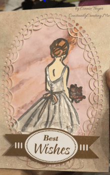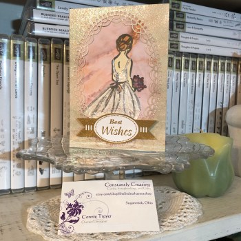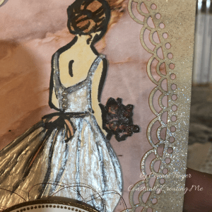 After she was stamped, I watercolored the bride’s hair, skin, bow, and flowers with watercolor pencils and used an AquaPainter on those places afterward. For the dress, I decided to experiment with some Nuvo Crystal Drops (Ivory Seashell color) new to my stash. Since that is also translucent, I was hoping it would soften the lines of the dress if I covered them with the liquid. I later went back over the dress again, using a paintbrush to smooth out the Drops on the paper. I also took Wink of Stella to the bride’s bouquet (though I erred first and grabbed my White instead of my Clear. Once it dried, I realized what I had done and went back over the bouquet with Clear as well.) It sparkles more in person than in the photo.