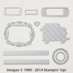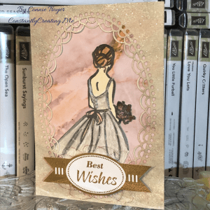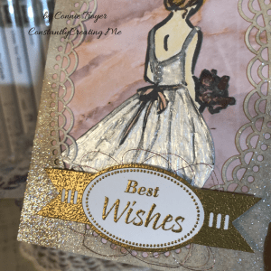 I was able to use several current SU products as well as a couple of retired products and ones from other companies (oops!). The focal point of the card is the bride stamp from the “Wonderful Moments” stamp set, set off by a lace oval from the Delightfully Detailed Laser-Cut Specialty Paper pack and a background of Petal Promenade DSP.