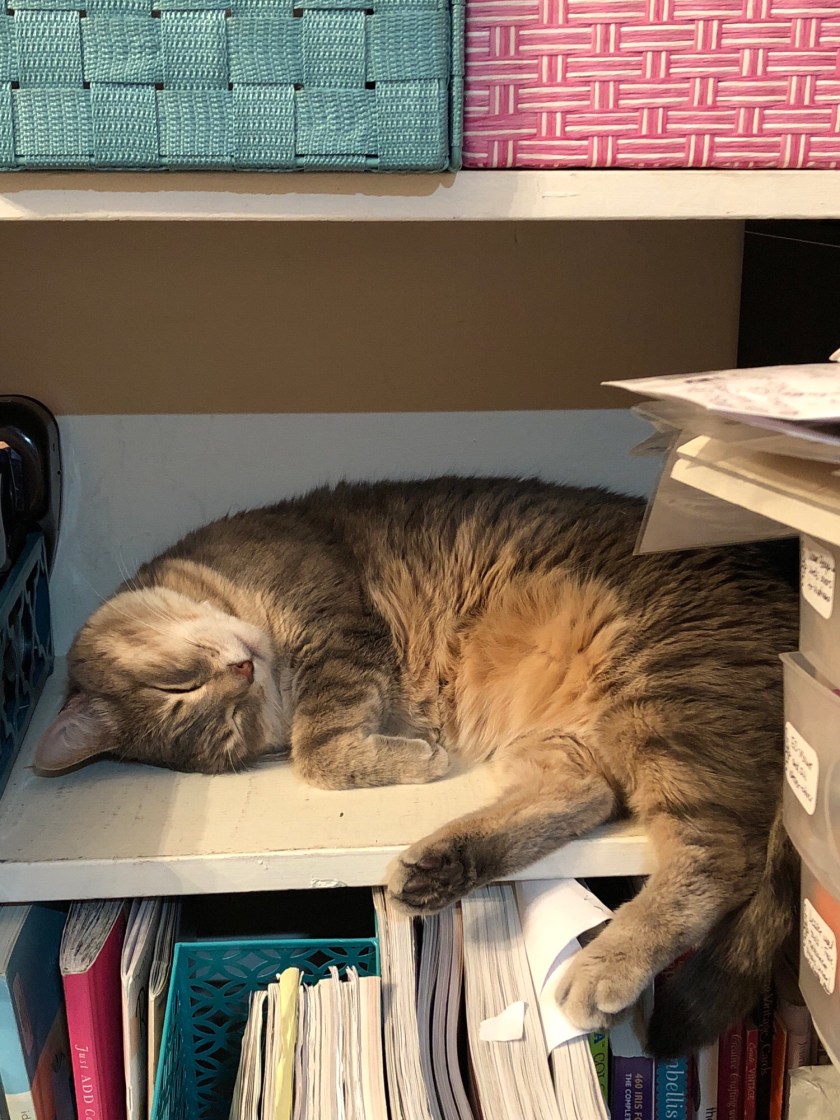 In the midst of tonight’s organizational endeavors, I found this. Which does not belong there. Which I did not put there. She likes being in the midst of things too. 🤦♀️