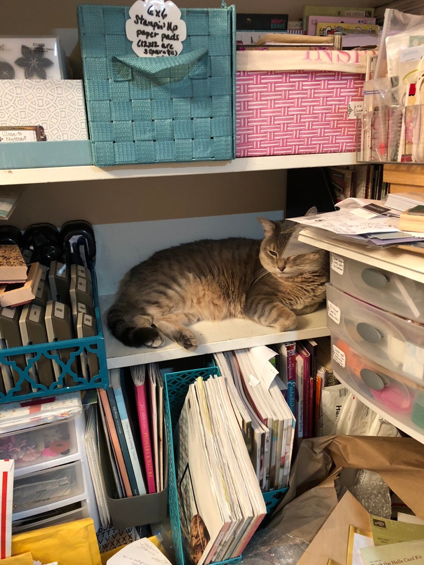 I got in a bunch of retired crafty things last week after Stampin’ Up’s new catalog came out. So this week I’ve been trying to organize something to make my craft room look better. Got in a ton of paper, so I’ve had to shift my paper shelves, which led to rearranging four boxes in the bookshelf and putting other designer paper in the cubbyhole hutch paper spot…which means I have to rearrange furniture to move the other part of the hutch in here and put the antique buffet into the guest room, which holds fabric in half of it (that I can’t currently sew because my machine needs to be looked at)…. Sigh. Everything depends on one thing, some thing, being finished first, before everything will be done. I’ll get there.