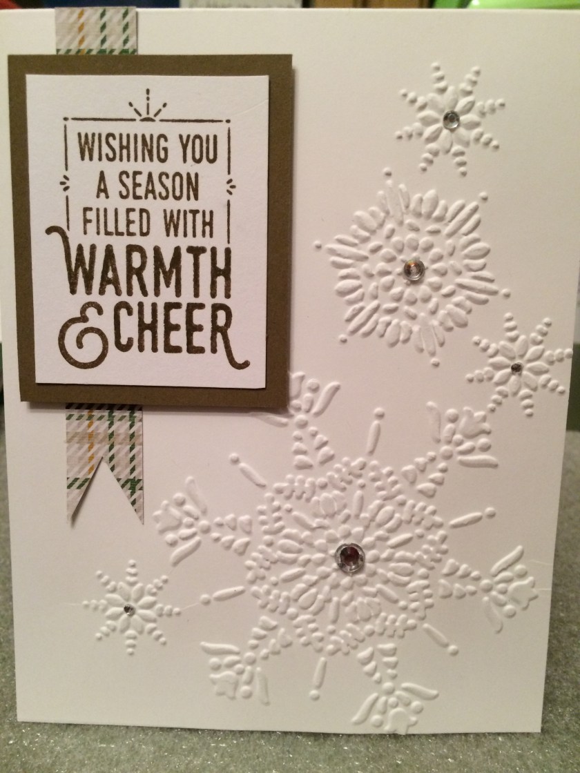 The inside of the card finished the thought begun on the front (“Just a Note”) with “Wishing You Happy Birthday.” Again not quite what I’d intended to say, but time really was of the essence, so I made do with the first couple things I found rather than creating a custom sentiment. And I’m the only one who overthinks these things, so it probably doesn’t matter. 🙂 The stamp sets I used for the inside are from Stampin’ Up (“Wrapped in Warmth”) and Close to My Heart (“Gracious Greetings”). I also embossed piano keys for the bottom border. The embossing folder I used is 5×7 and entitled “Keyboard,” from Cuttlebug.