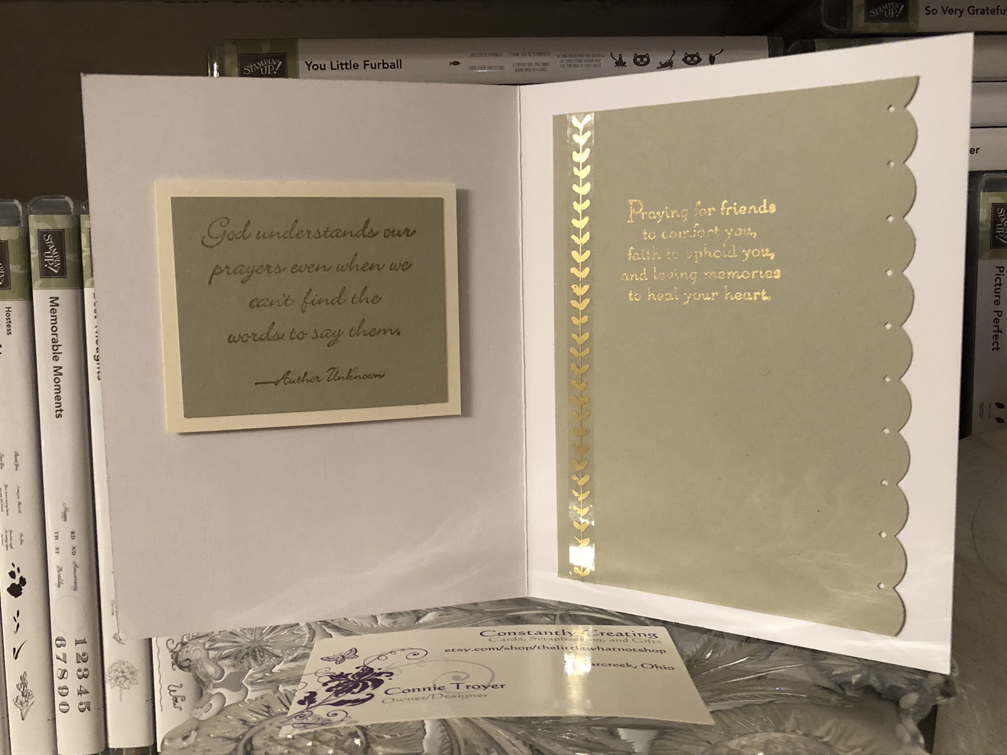I chose the same SU cardstock from the front for the inside, since the inside of the card base was white. I matted the left-hand sentiment with cream for contrast. Both stamps were inked with an Encore Gold Metallic pad and heated with a heat gun afterward. The left-hand sentiment is from a retired SU set called “Words of Wisdom,” and the one on the right is from the retired SU set “Thoughts and Prayers.” I used a gold border strip from the retired SU “Painted Love Gold Vinyl Stickers” from the last catalog down one side and edge-punched the other with the EK punch from the front.