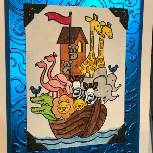 I wasn’t sure whether to use my Stampin’ Blends alcohol markers to color it or my usual: watercolor pencils with either an Aqua Painter or a Blender Pen. I figured I’d do one of each type of coloring and leave the extra in my “card parts” bin for faster cardmaking later. Because those mediums require different inks to control the color, I stamped the ark image from “Perfectly Paired” once in Memento Tuxedo Black (for the alcohol markers) and once in SU’s Archival Basic Black (for the watercoloring). I labeled the backs with a pencil so I’d know which went with what…and then promptly started coloring the wrong image with the wrong medium because I was “doing,” not “thinking.” 🙄🤦♀️