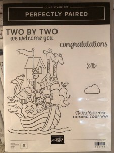 Our theme this month is “Celebrate Spring,” in whatever way we want to interpret that. Because I’m also making cards for my local gift shop, I chose to go with the “new birth/baby” idea. I couldn’t wait to get my hands on Stampin’ Up’s “Perfectly Paired” cling stamp set when it came out—it’s all about babies and features a Noah’s Ark image, one of my favorite themes for little ones. This stamp set (so far as we know) is only available for a couple more months since it’s in the current Occasions catalog.