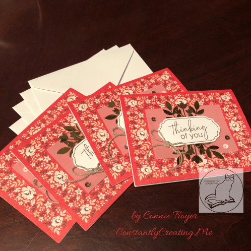 Free with your purchase, the kit is a good investment. Quick to make up and easy to have a few cards on hand or to give as gifts, it’s one that will appeal to many (if for convenience’s sake if nothing else!), and the cards are lovely to boot. They’re also very easy to adapt to other styles or make into alternate designs. The envelopes are all lined with either Balmy Blue or Petal Pink and make a nice “wow” moment when they’re opened as well.
