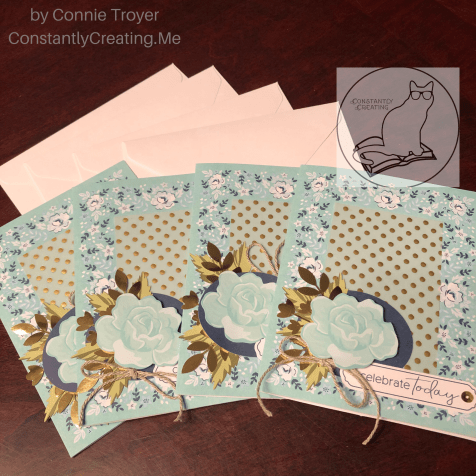 When I considered sentiments for the insides of the cards and looked through my current stamp sets, I found four that will work nicely for wedding or anniversary, general celebrations, or celebrating a special person or a special day that may or may not be love-related. Though they’re not stamped on the cards yet, I plan on using “Be strong, be happy, be you” from Rooted in Nature; “Wishing you the best on your special day” from the Perennial Birthday set; “Hoping you experience love and joy today, tomorrow, and always” from the Last a Lifetime set in the Mini catalog; and “Here’s to always finding joy in one another’s laughter, warmth in one another’s embrace, and love in one another’s lives” from Path of Petals. I think the “celebrate today” cards could also be used as graduation, retirement or promotion, even the birth of a baby or baby shower, and more occasions as well, if you didn’t feel the need to use the standard icons of the event. They would work fine as blank cards too—celebrating life or spring or no reason whatsoever!