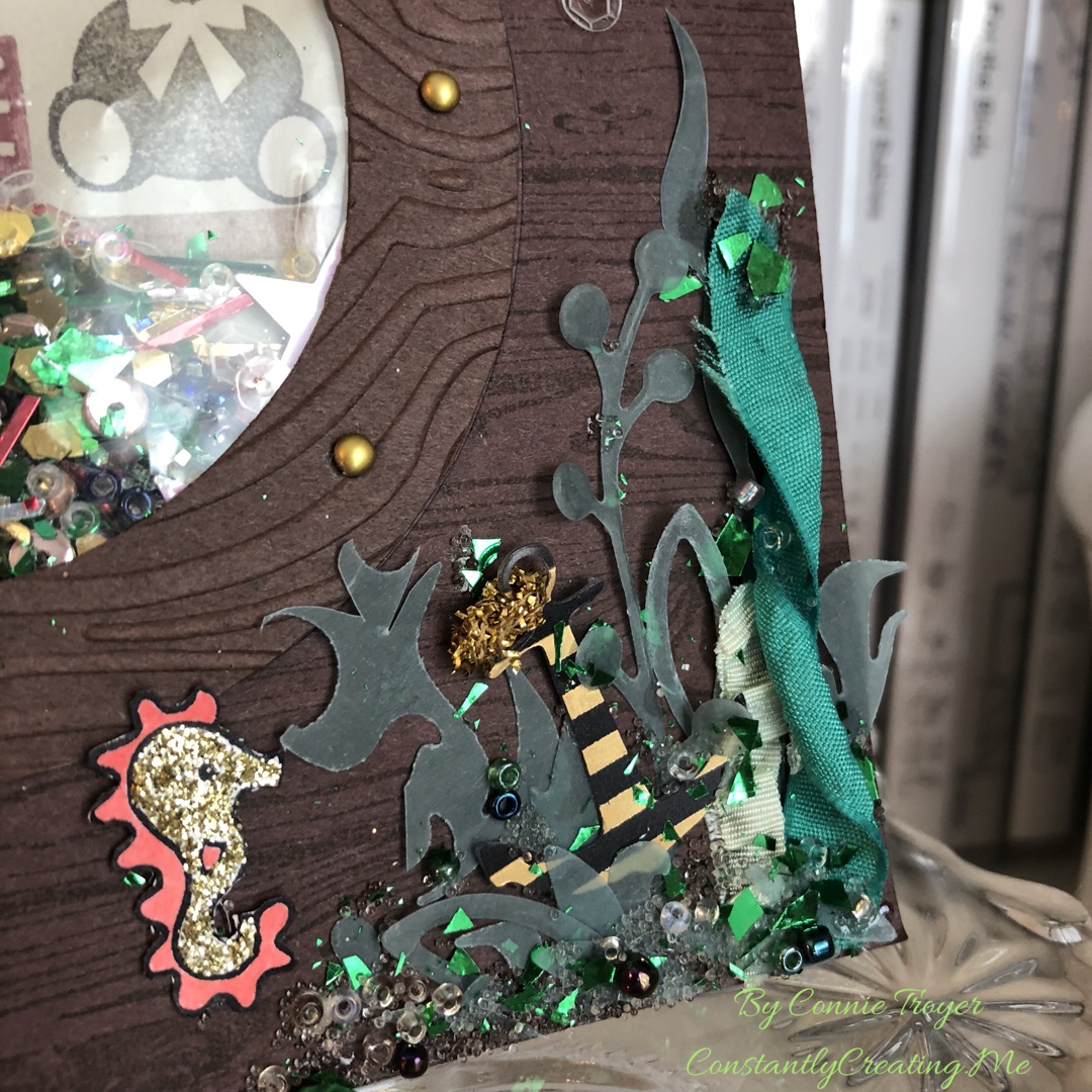 So my porthole was done–and I’d previously colorized my little mermaid and her friends with watercolor pencils, an Aqua Painter, Adirondack Dimensional Pearls, Stickles, Nuvo Glitter Drops, and Distress Glitter Stickles. I’d actually tried to stamp her tail on some very nice flaked cardstock that reminded me of scales, but that didn’t work like I’d thought it would (and I should have known better anyway–another goof), so watercoloring and two layers of glitter glue ended up working for the tail instead. I fussy-cut them all out, glued the mermaid to the card front in between two of the mini brads in the porthole, and started trying to figure out my seaweed issue. In my head, I saw things floating near her on the outside of the ship, like her friends or the occasional sea life. I ended up with more things there than I’d intended, but I think it’s cute anyway.