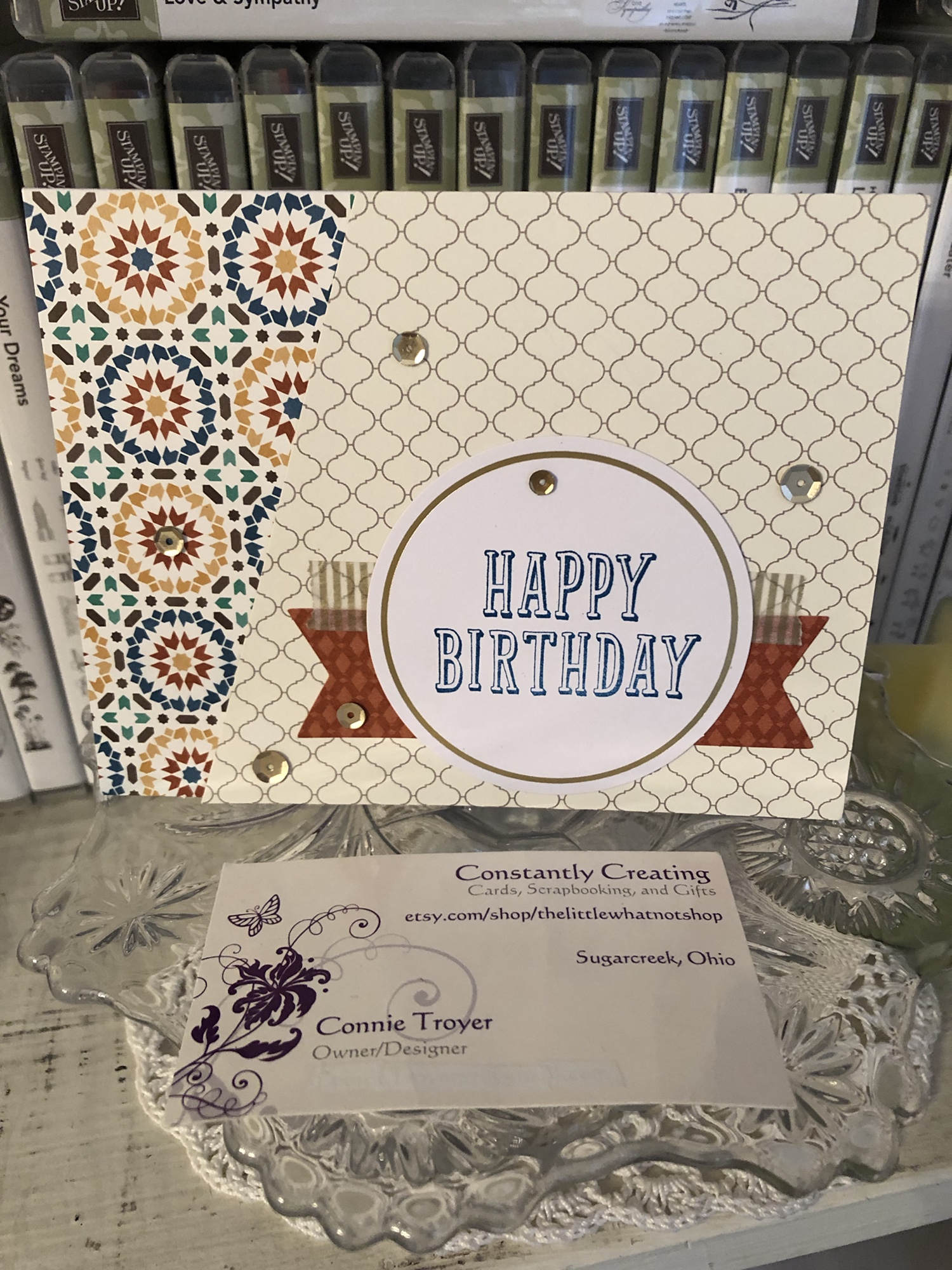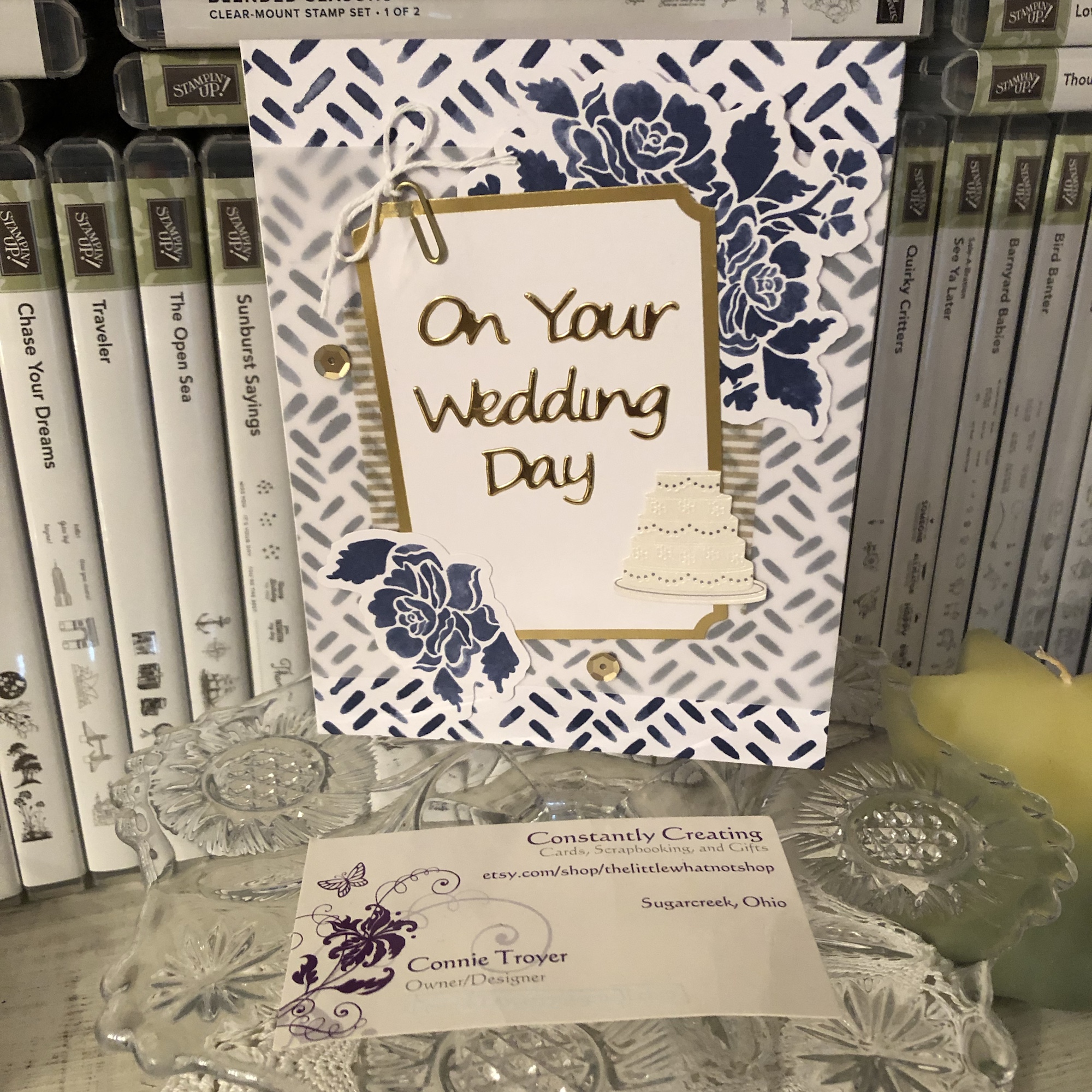 I was able to pull out each of the colors used on the card with those embellishments, so I was pleased. (The white space in the corner was just too much for me. If you follow my blog posts, you’ll have heard that I’m not a big fan of white space.) I also felt that doing something different with the gems in that way spoke to the “unique” idea of the card.
