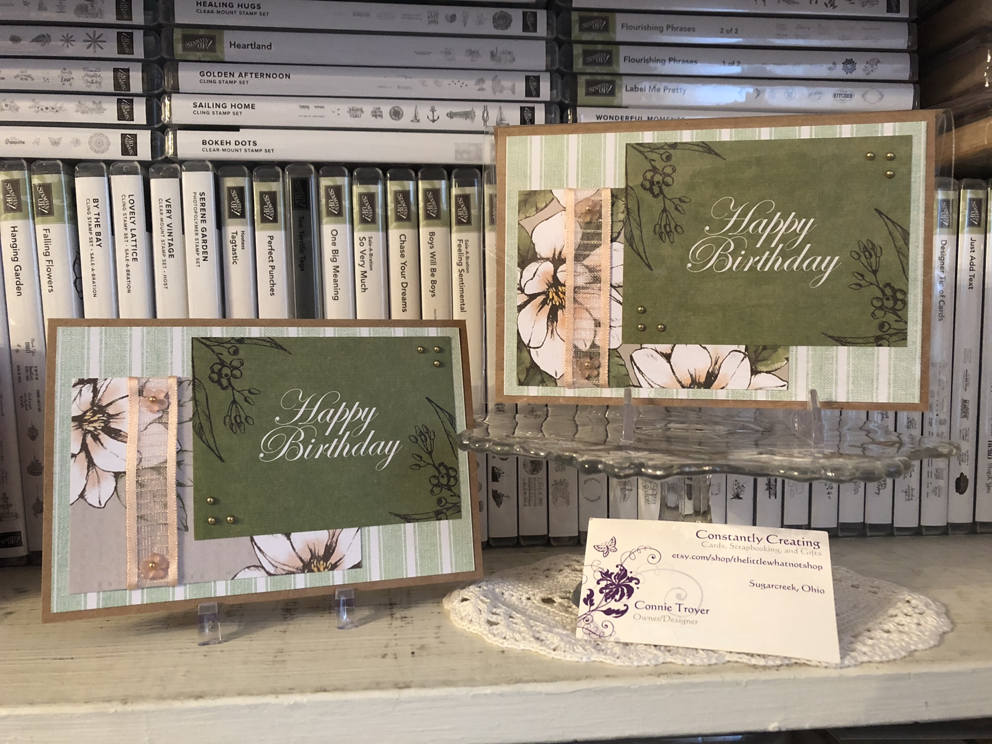 Hello again! It’s time for another Stamp with Amy K Blog Hop! Our focus is on birthday cards this time. I’ve had some busy, busy weeks here. Hope yours has been quieter. It’s time for another handmade-card delivery to my local gift shop, so I took a few hours last weekend to churn through some cards and prepare them. Stampin’ Up’s gorgeous Magnolia Lane Memories and More Card Pack and the complementing Magnolia Lane Large Specialty Memories and More Cards and Envelope Pack made it very easy to have two cards done in record time.