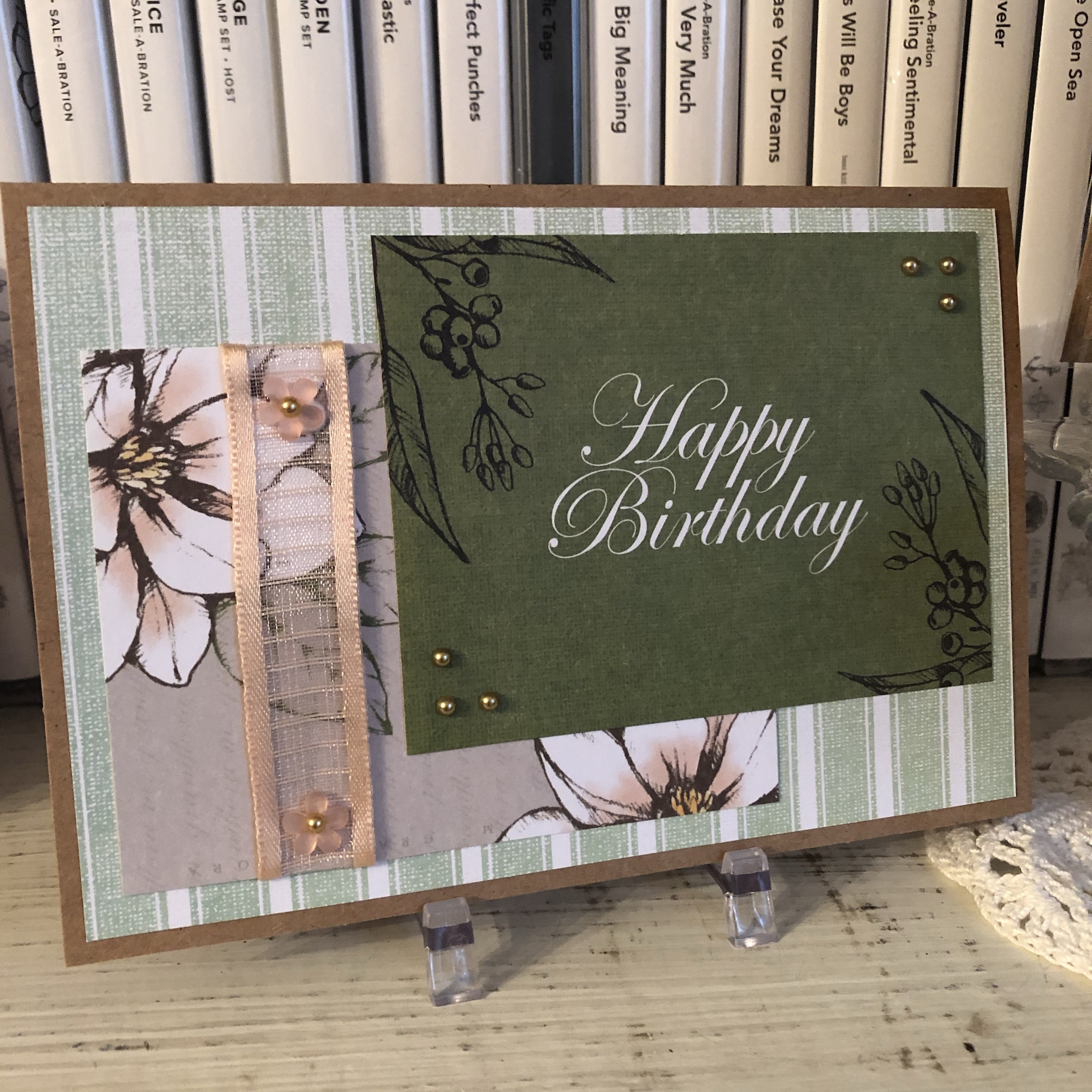 I fussy-cut around the foliage of a retired #stampinup Magnolia Lane Memories and More card before popping it up on Dimensionals and running some retired #petalpink and white baker’s twine behind it and for the bow. I’ve used a retired kraft Magnolia Lane Cards and Envelopes card base and used some retired #envelopepaper on the inside. Retired #su gems on the card front: Frosted Flower Embellishments and Share What You Love Artisan Pearls. Current gems: Elegant Faceted Gems.