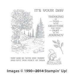 Stampin’ Up has several kinds of coloring tools available. I began my card by using watercolor paper and stamping the main “Peaceful Place” image on it in the retired Basic Gray archival ink so that I could watercolor with my colored pencils and Aqua Painters. I wanted a lighter “no-line” sort of look, so I used Basic Gray rather than Basic Black. (You can see the complete list of current items I used below the list of blog participants.) The “Peaceful Place” stamp set is available in both Clear-Mount and Wood Mount. I have not used the current Fluid 100 Watercolor Paper in my card today, but I’m looking forward to getting some and testing it out. I’ll let you know how I like it!